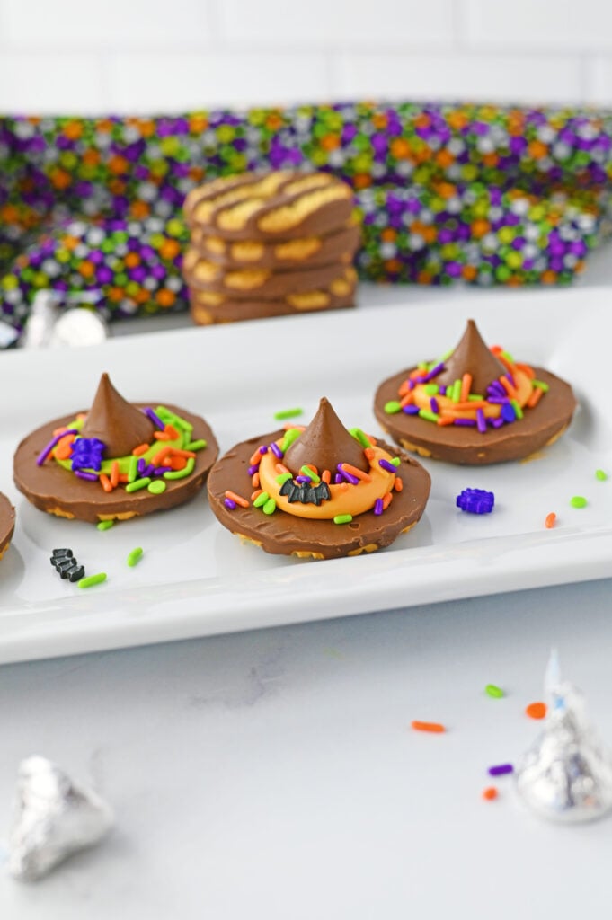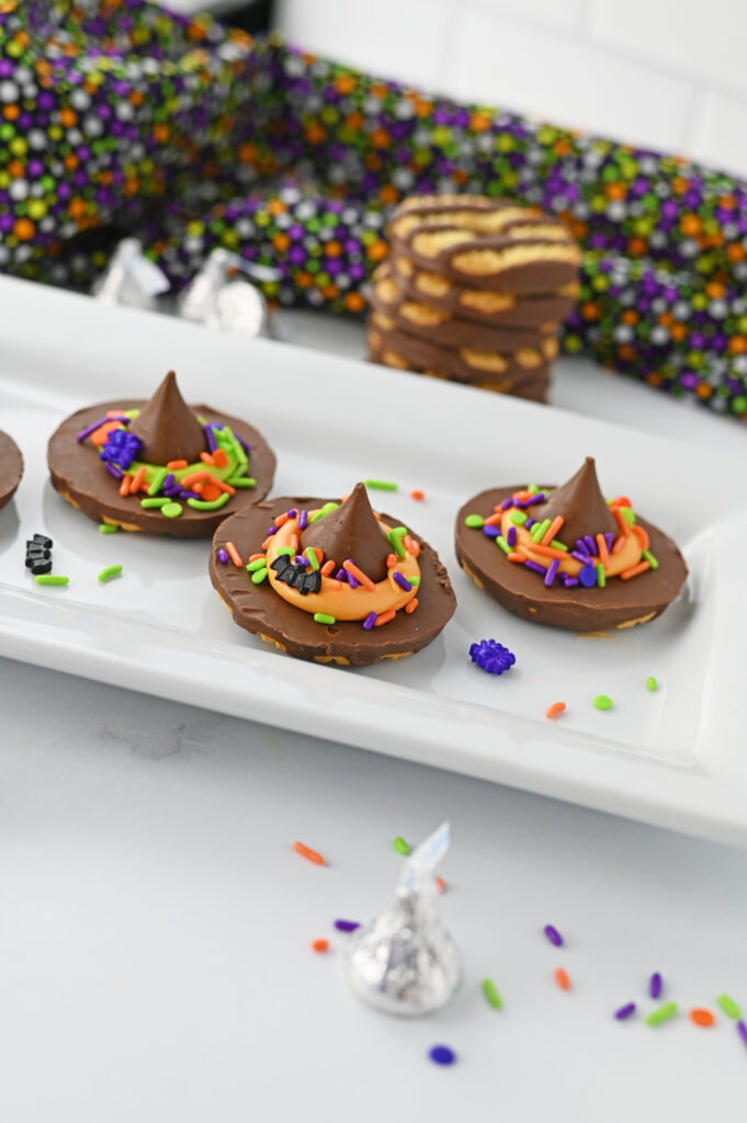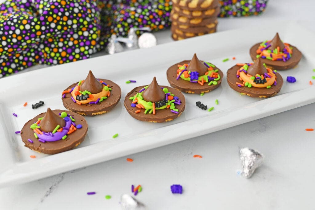 Witch Hat Cookies are the perfect no-bake Halloween treat! Made with Fudge Stripe cookies, Hershey Kisses, colorful icing, and sprinkles, they're quick, easy, and fun for kids to help decorate. These festive cookies are great for Halloween parties, treat bags, or spooky movie nights.