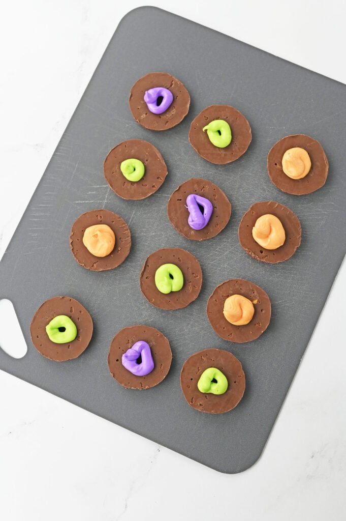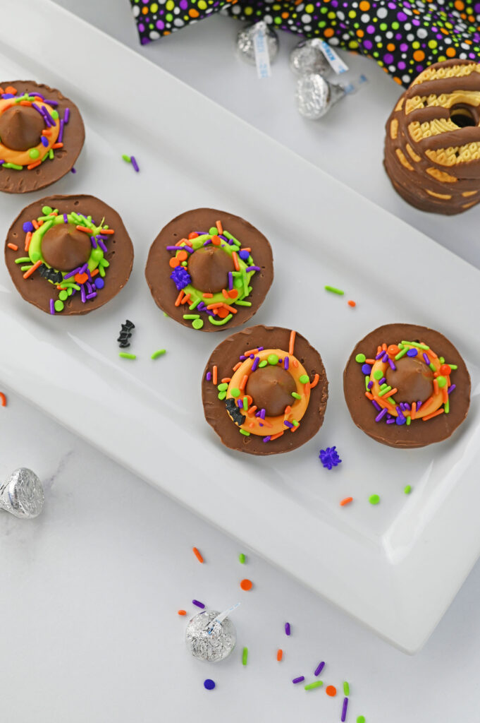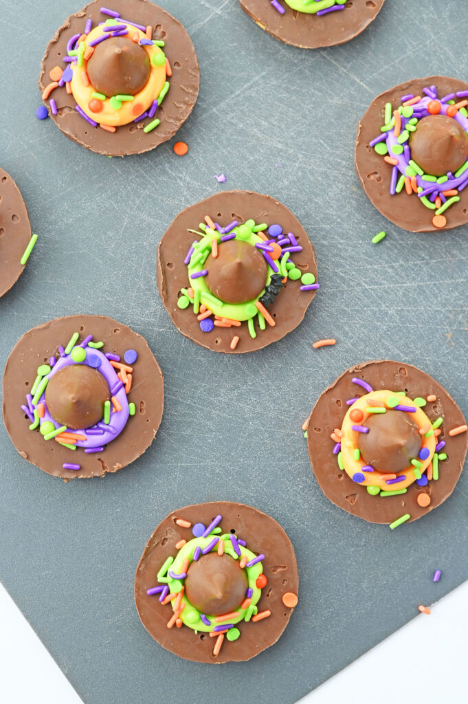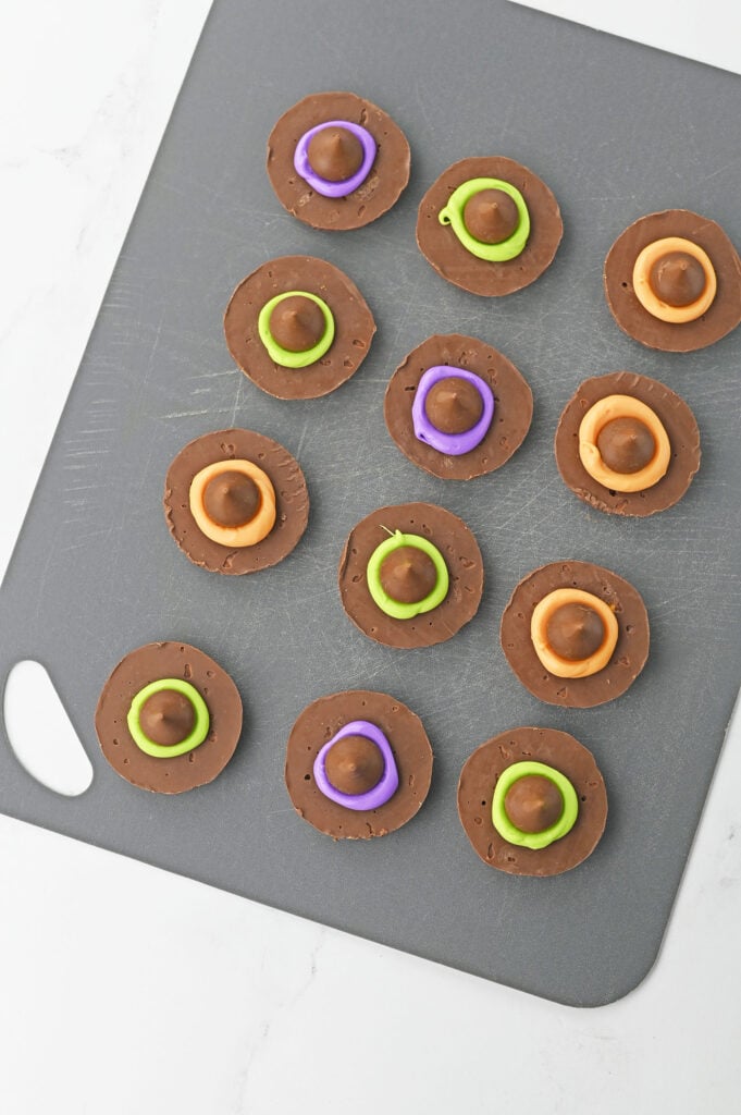 - Place a Hershey kiss candy onto each, pressing down to form the ring of frosting around the “brim of the hat”.