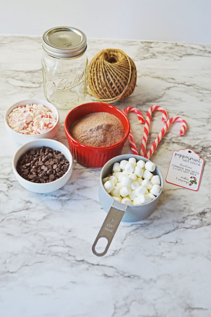Your family and friends will love receiving this diy peppermint hot chocolate mix, and it makes wonderful gifts for teachers, coaches, your mail delivery person, package or grocery delivery service person, etc..