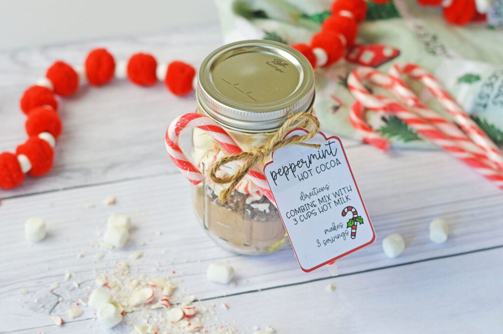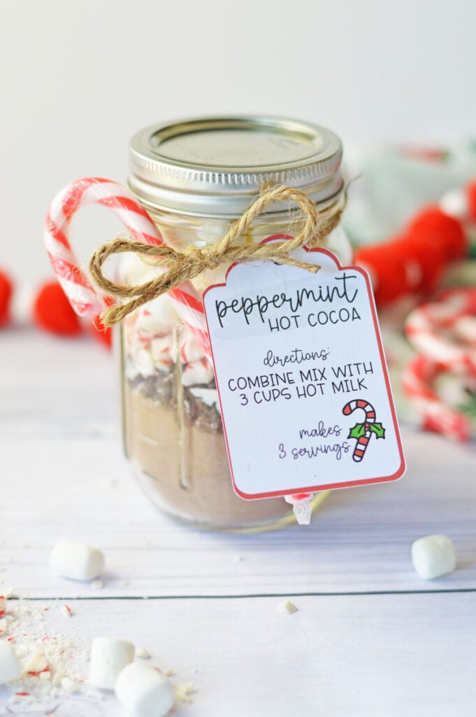 If you are looking for a fun homemade gift idea this Christmas, our Peppermint Hot Chocolate in a Jar is a great easy diy gift. I even made this free printable gift tag you can download to really make this hot cocoa gift jar complete. This gift makes the best peppermint hot cocoa mix, we combined all of the dry ingredients, and with the fun tag, your gift recipient will know to just mix the jar with hot milk for a delicious peppermint hot cocoa treat. Each jar makes 3 servings of cocoa!