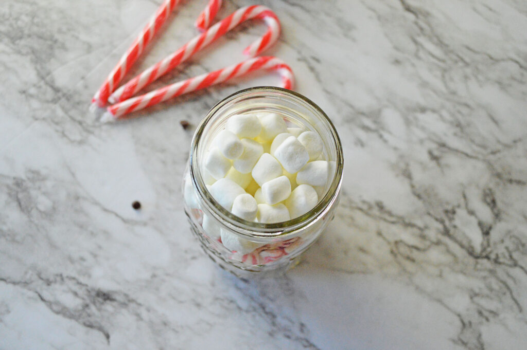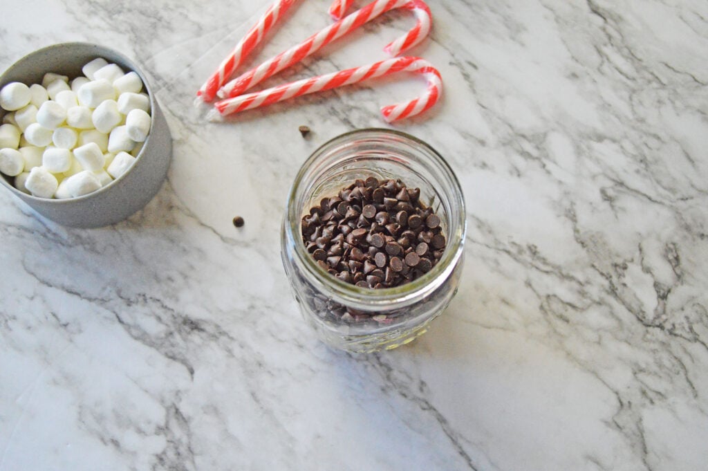 - In your 16 ounce mason jar, layer hot chocolate mix first, followed by chocolate chips, crushed peppermint, and then marshmallows.