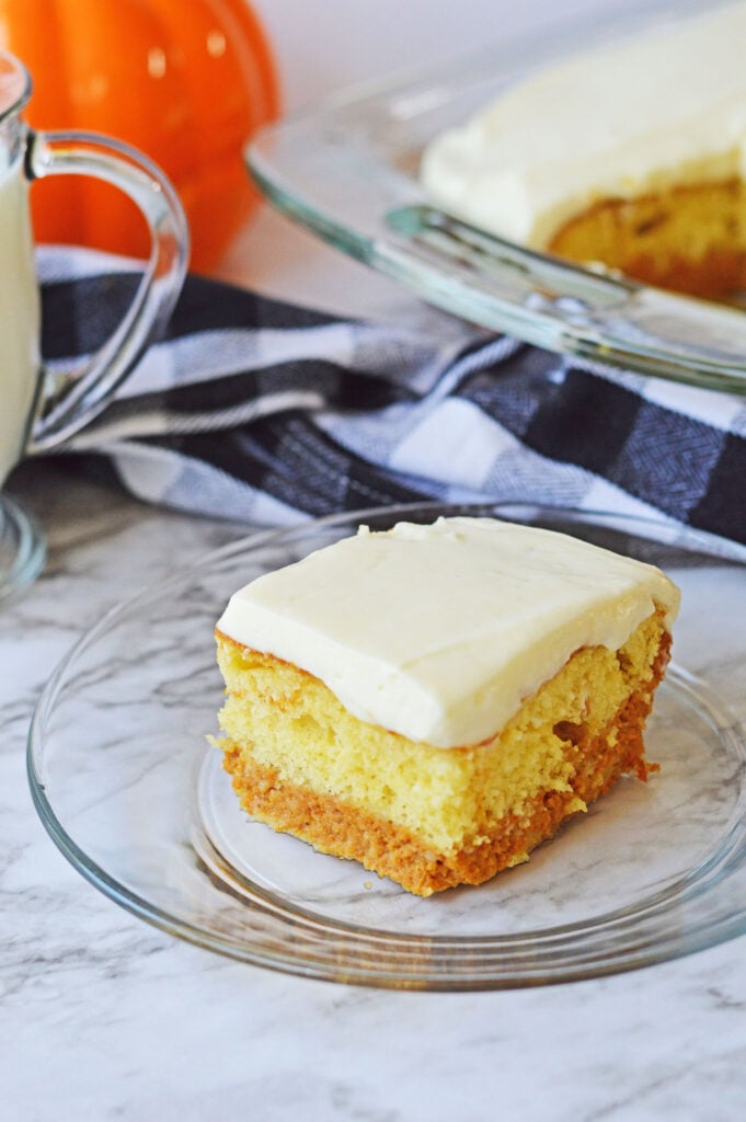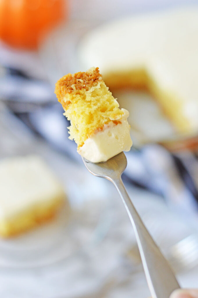Delicious pumpkin magic cake layered with flurry butter yellow cake, pumpkin pie, and whipped cream cheese frosting!