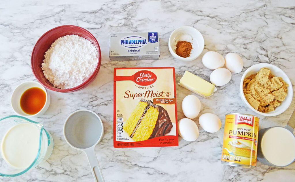 The magic of this cake comes from pouring the cake layer in first, and the layer of pumpkin pie on top, which then switch places while the cake bakes so that the pumpkin layer is on the bottom. It is so neat and makes such a delicious cake. We topped ours with a fluffy whipped cream cheese frosting. Let’s talk about how to make it!