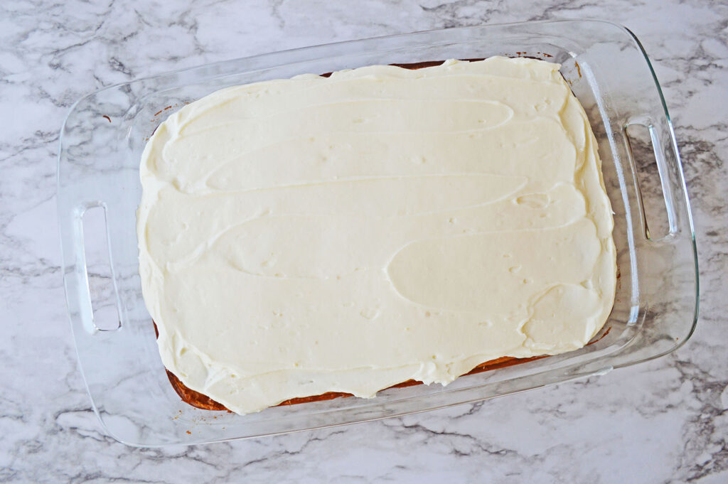 Step 12: Smooth the frosting evenly over the top of the cooled cake.