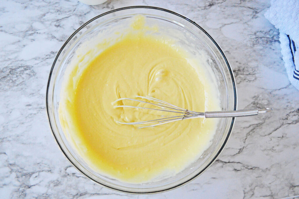 Step 2: In a large bowl, whisk together butter yellow cake mix, water, butter, and 3 eggs. Whisk until well combined and there are no lumps of cake mix.