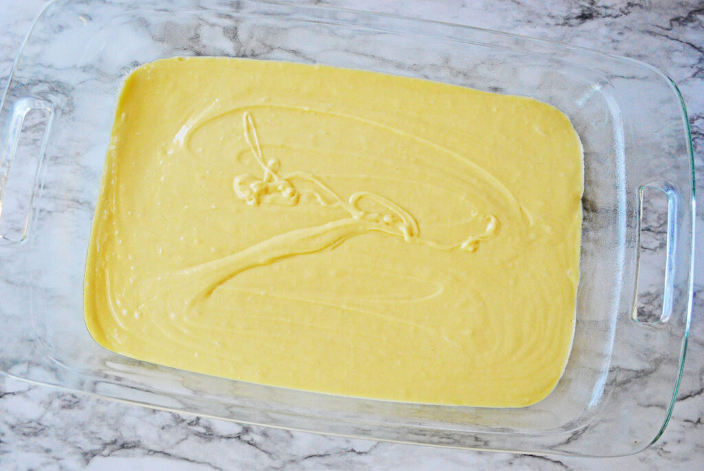- Pour into the 9x13 inch pan, and smooth out evenly.