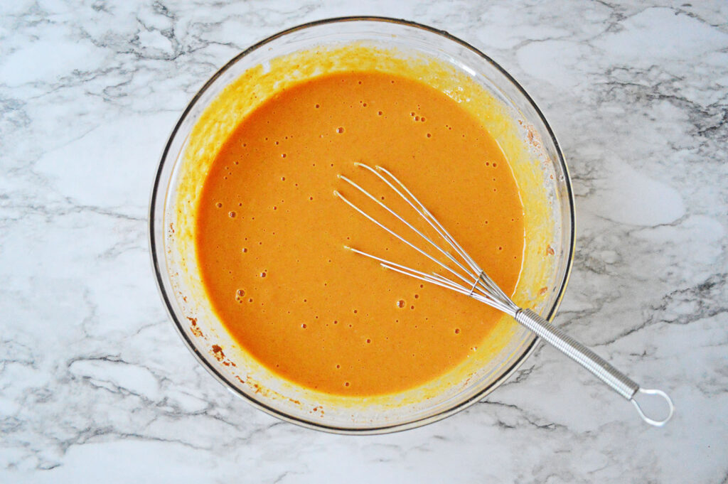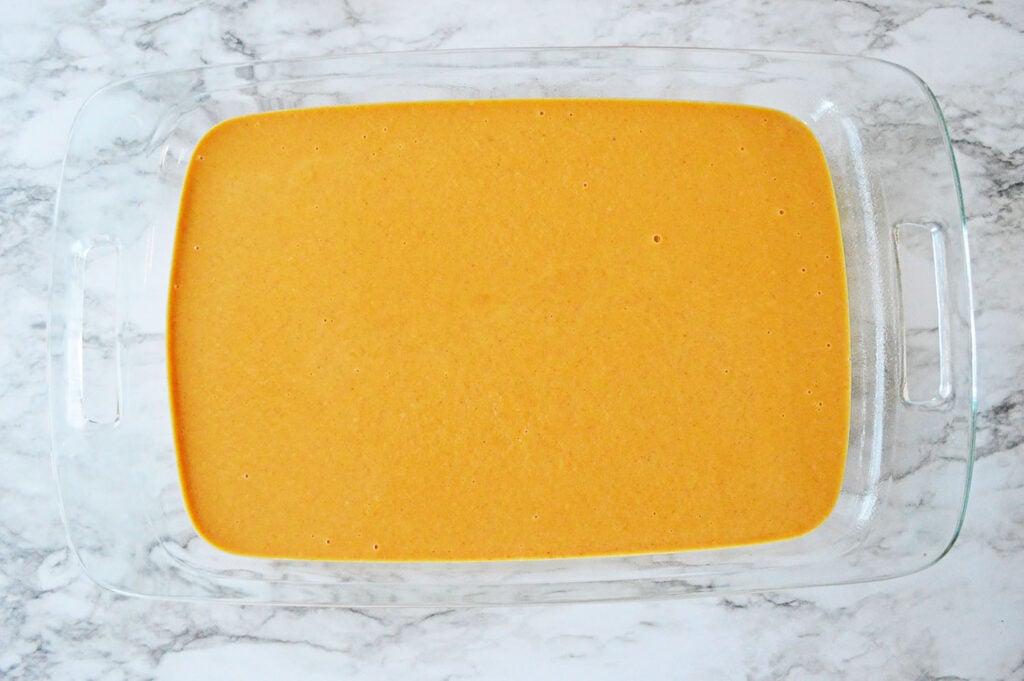 - Pour the pumpkin mixture evenly over the cake mixture, and gently smooth out evenly.