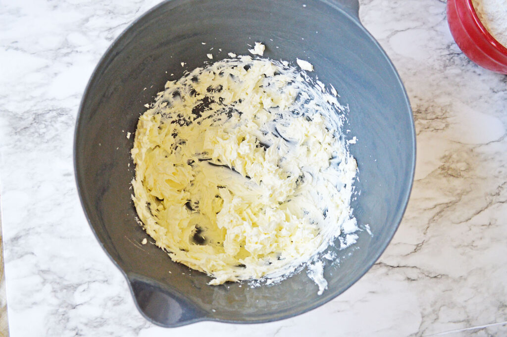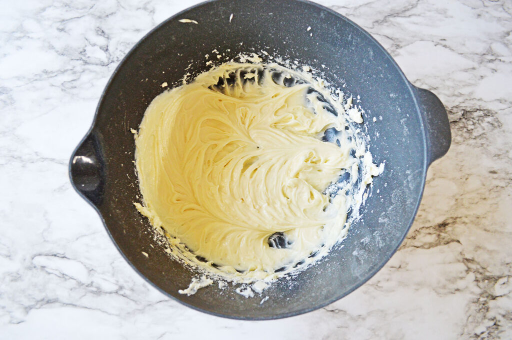 - In a large mixing bowl, use a mixer to beat cream cheese until smooth.