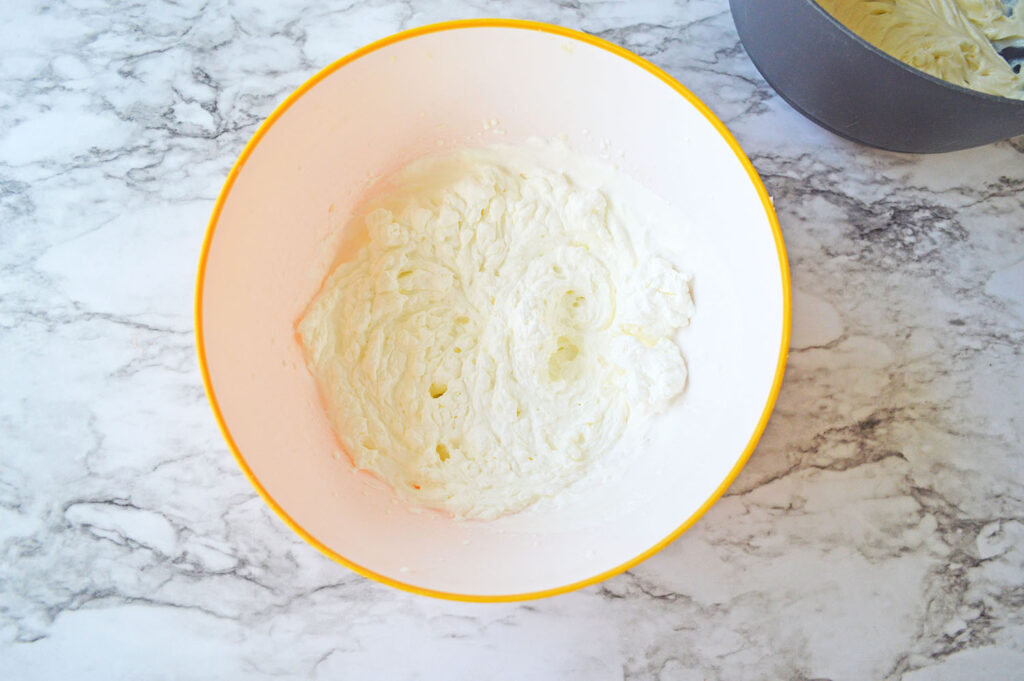 - In a separate bowl, use a mixer to mix the heavy whipping cream for 2-3 minutes, until peaks begin to form and it has a whipped cream consistency.
