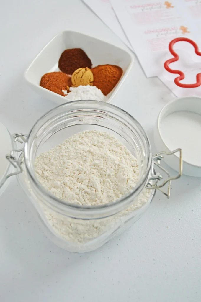 - To make the jar, layer your flour first, then seasonings, and salt.