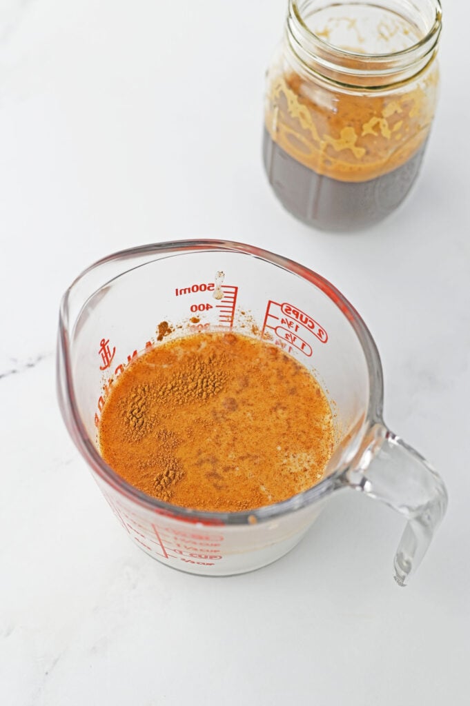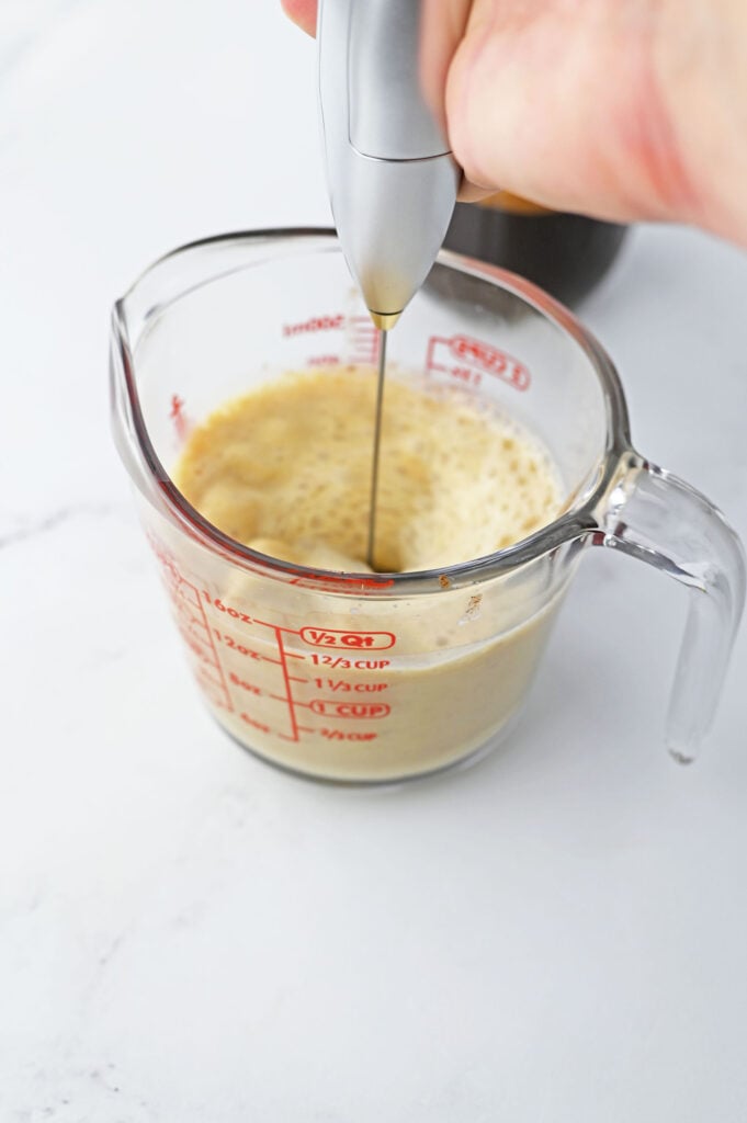 Step 1: In a large measuring cup, use a milk frother or immersion blender to blend together milk, pumpkin, maple syrup, vanilla, pumpkin pie spice, and a pinch of salt.