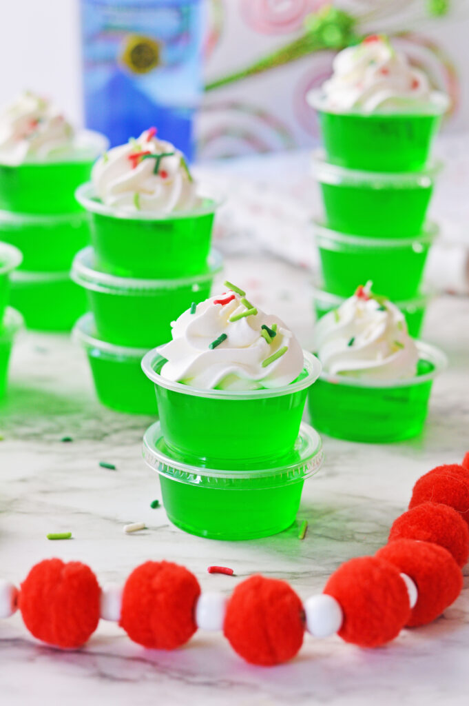 Festive Christmas Jello Shots with red and green layers, vodka, whipped cream, and sprinkles! Easy, fun, and perfect for holiday parties.