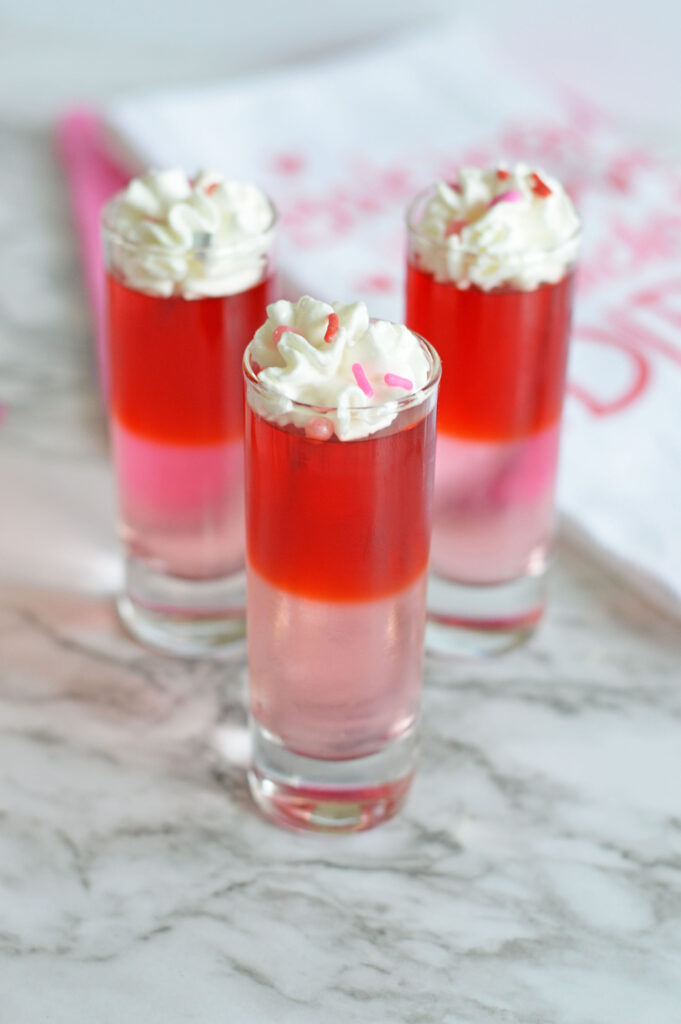 We used two different jello flavors for these fun and festive shots, plus we topped them with whipped cream and some super cute Valentine’s Day sprinkles.