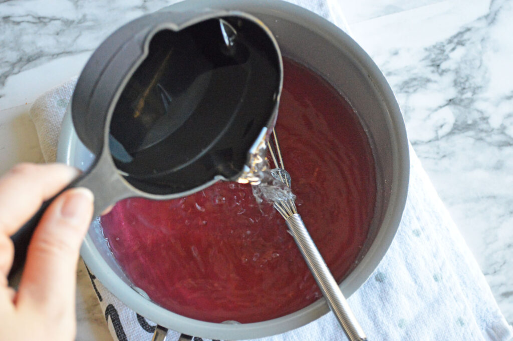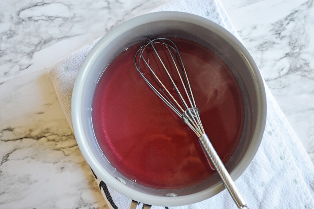 Step 4: Once that layer has set, make the red layer. Bring 2 cups of water to a boil. Remove from the heat and whisk in cherry jello, stirring until dissolved.