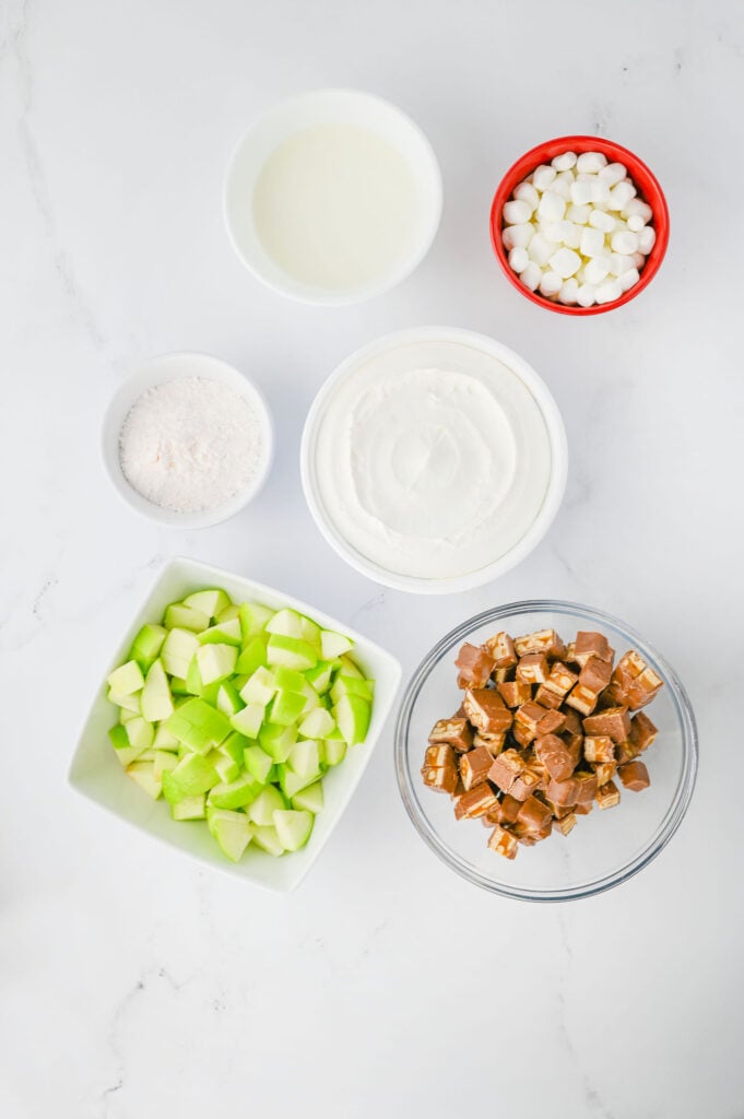 Gently fold in the chopped apples, snickers bars, and miniature marshmallows until evenly distributed.