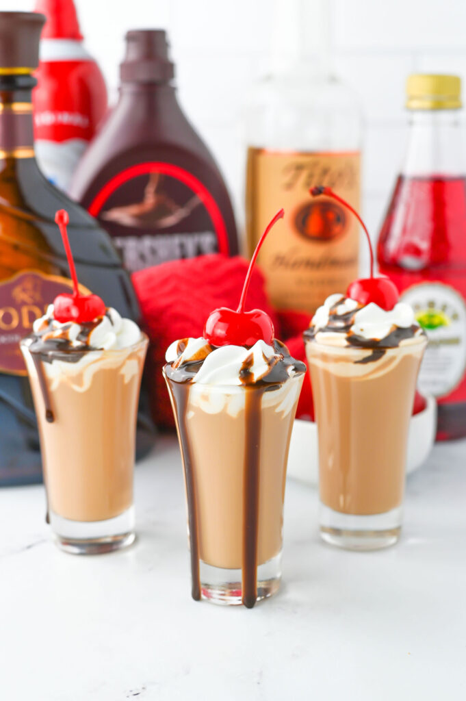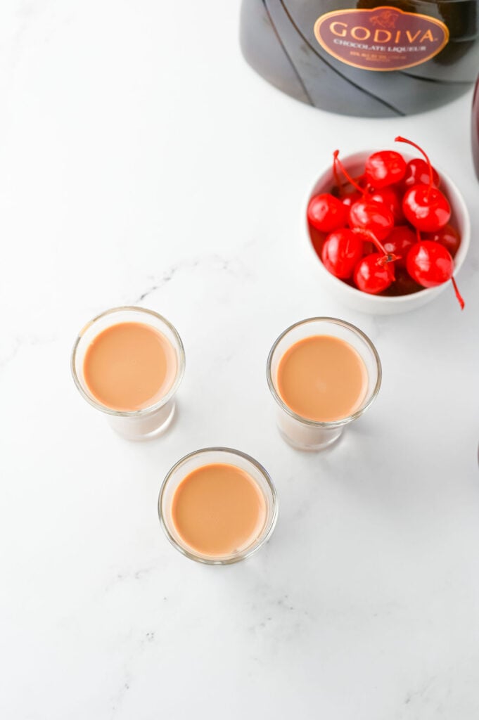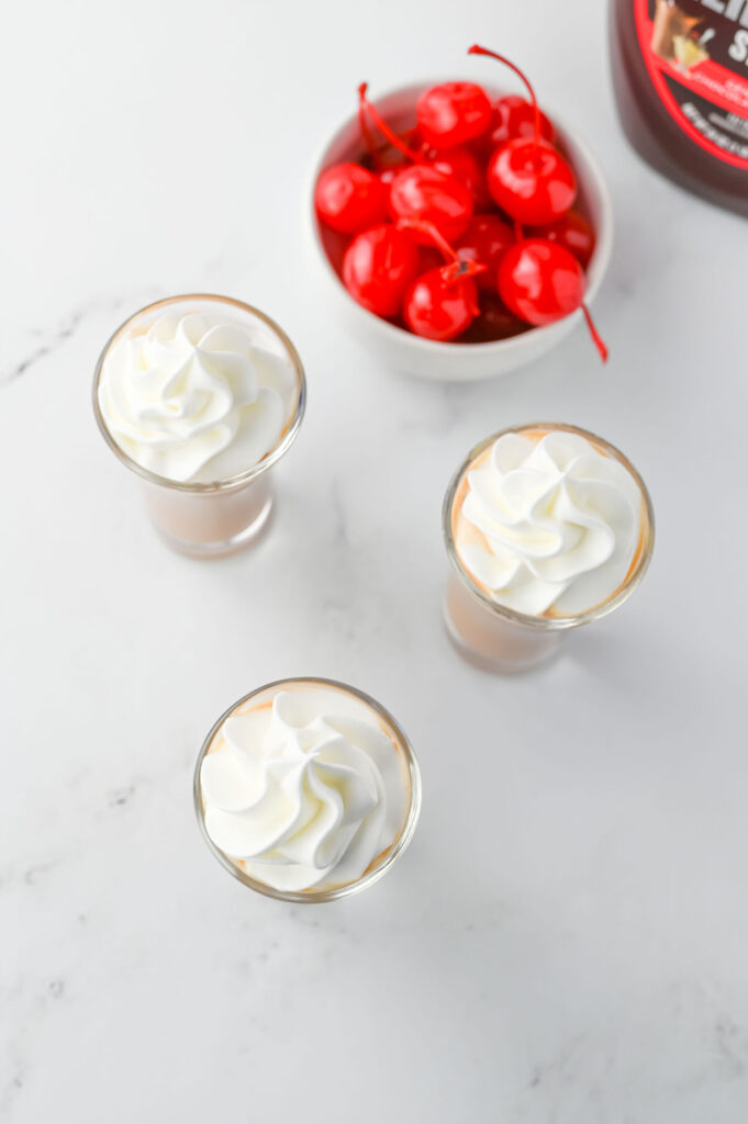 Step 4: Garnish the shots with whipped cream, chocolate syrup, and a maraschino cherry, if desired.