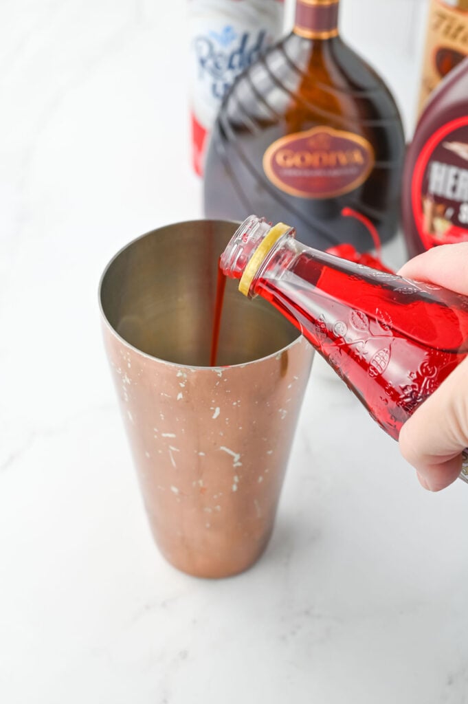 Step 1: To a cocktail shaker, add ice, chocolate liqueur, vodka, and grenadine.