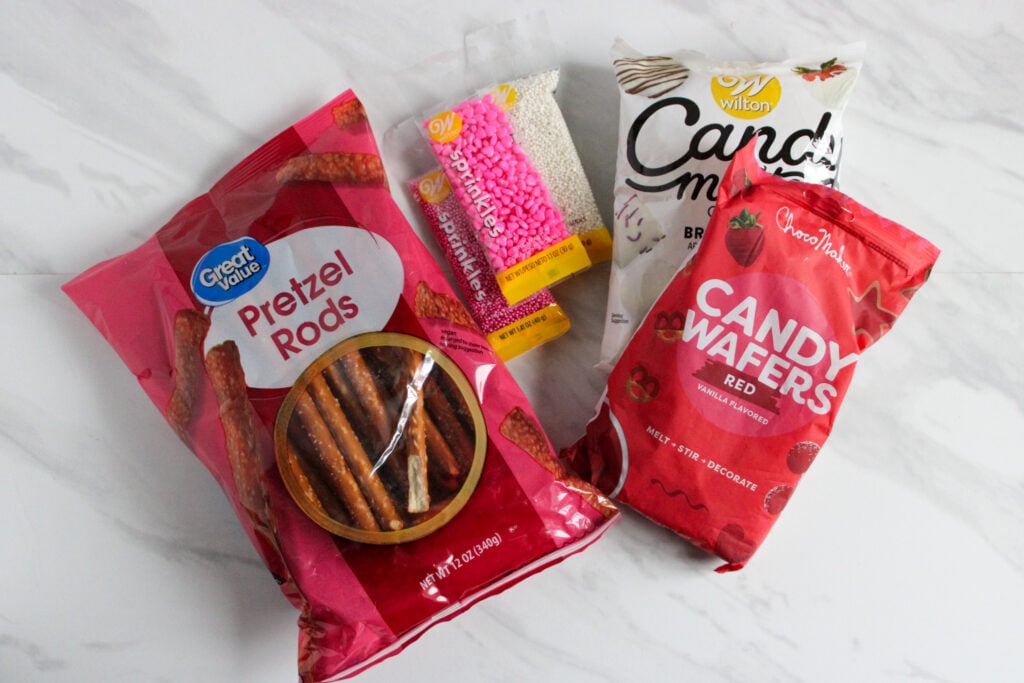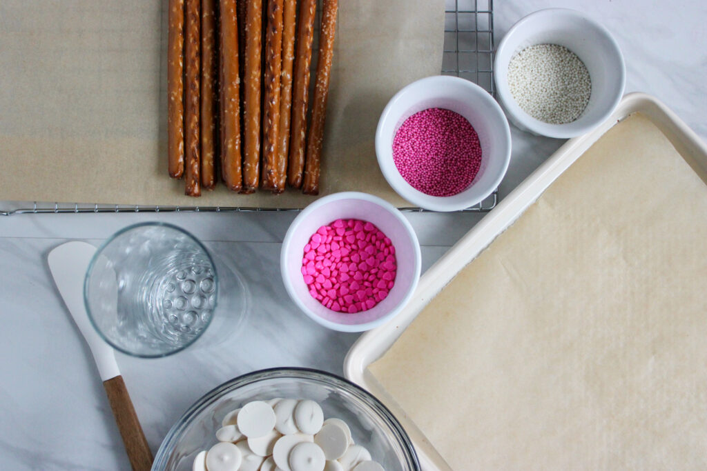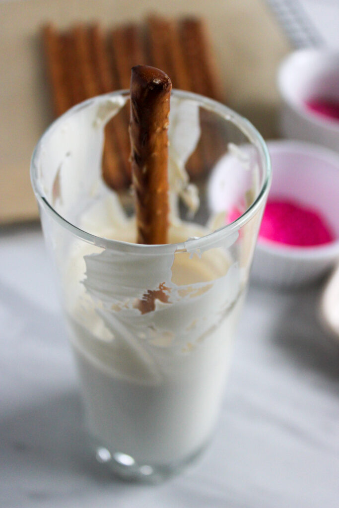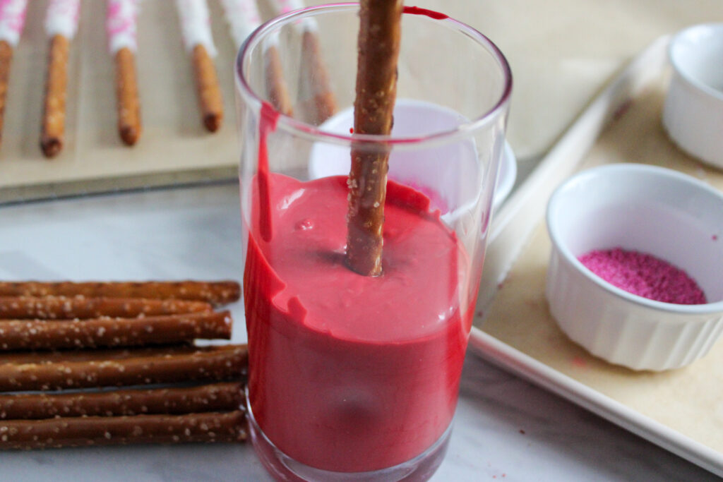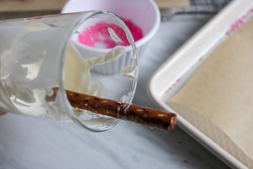 - Dip the pretzels. Insert a pretzel rod into the center of the glass and spin to coat evenly. For more coverage, tilt the glass while spinning. Alternate between the white and red candies.