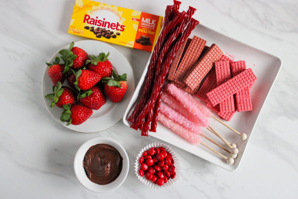 - For the board, start with larger items like pretzels, twizzlers, and strawberries.